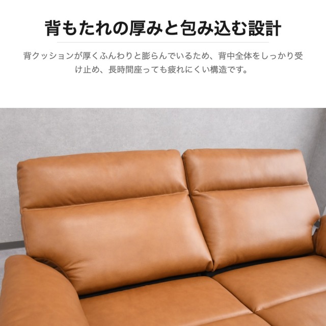 特徴 | 分厚い本革を使用した高級感溢れる電動リクライニングソファです。背クッションが厚くふんわりと膨らんでいるため、背中全体をしっかり受け止め、長時間座っても疲れにくい構造です。適度な反発の座面クッションでリラックスしてご使用いただけます。ふっくらと丸く仕上げたアームは肘や腕をやさしく受け止め、長時間座っていても疲れにくい設計です。座ったまま手を伸ばすだけでリクライニングの角度を調整できるボタンが2つ備わっており、USBポートも搭載しています。 |