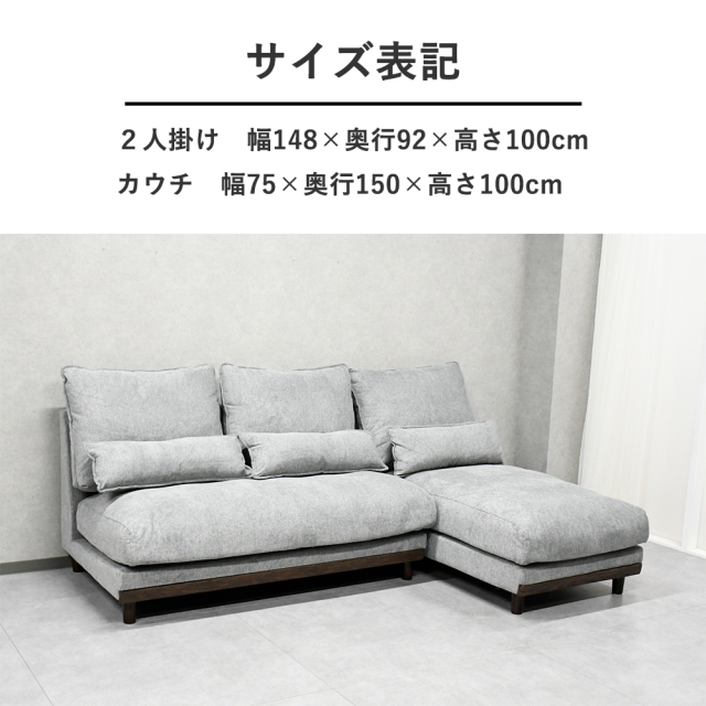| サイズ | 2人掛け 幅1480×奥行920×高さ1000mm カウチ 幅750×奥行1500×高さ1000mm |