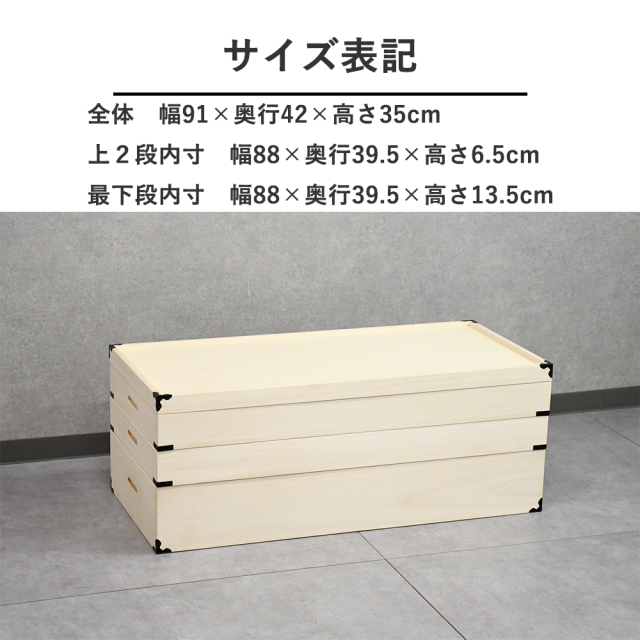 | サイズ | 幅910×奥行420×高さ350mm 上2段内寸 幅880×奥行395×高さ65mm 最下段内寸 幅880×奥行395×高さ135mm |