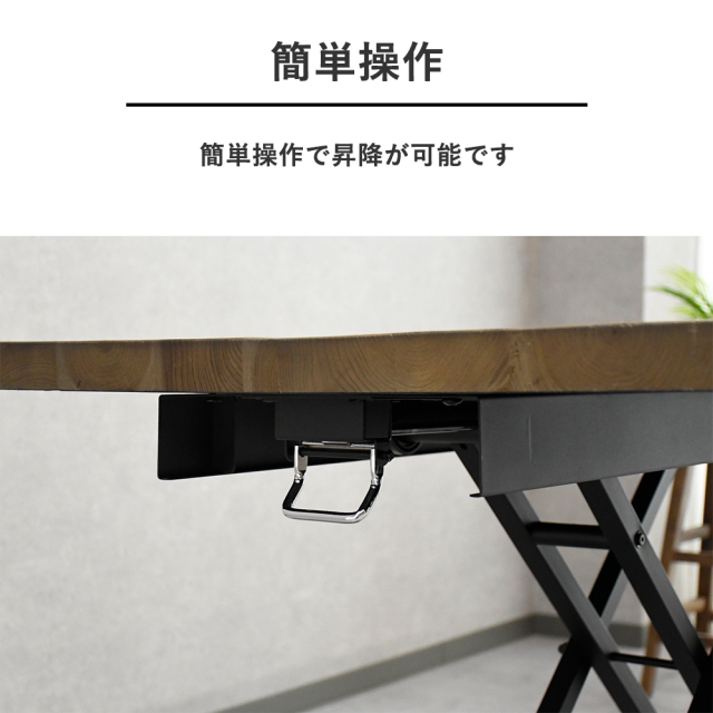特徴 | アウトレット品の無垢材を使用した昇降式リフティングテーブルです。センターテーブルだけでなくダイニングチェア等に合わせてもご使用頂けます。 |