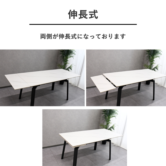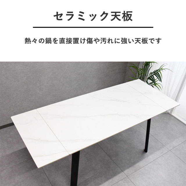 特徴 | 高級感のある、伸長式で便利なセラミックダイニングテーブルです。耐久性・耐熱性に優れており長くご使用いただけます。 |