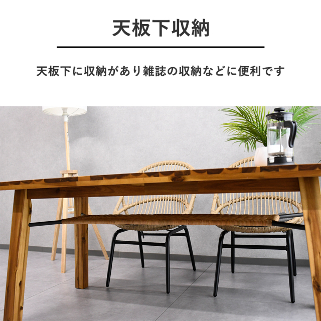 特徴 | アカシア無垢材を使用した存在感たっぷりのダイニングセットです。置いてあるだけでリゾート気分が味わえるインテリアアイテムです。 |