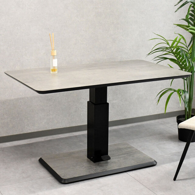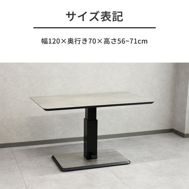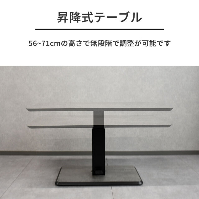 特徴 | 120cm幅の昇降テーブル。ソファーやチェアを合わせデスクワーク・食事など使い方自由。 |