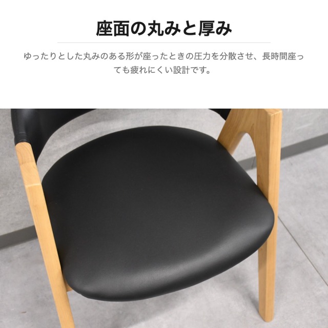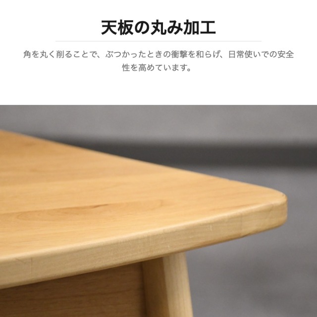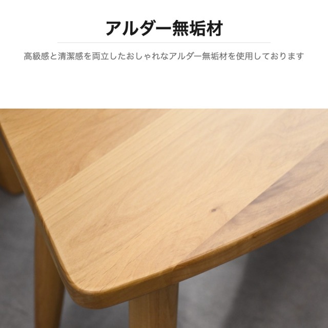このダイニングテーブルは、アルダー無垢材を使用しており、自然の風合いを生かしたデザインです。丸型の天板は、どの席からも手が届きやすく、全員の距離を均等に保ちます。また、丸みを帯びたエッジが安全性を高め、家族での使用に最適です。脚の中央接合部が安定感を与え、しっかりとした構造を保っています。