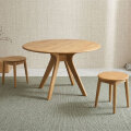 特徴 | このダイニングテーブルは、アルダー無垢材を使用しており、自然の風合いを生かしたデザインです。丸型の天板は、どの席からも手が届きやすく、全員の距離を均等に保ちます。また、丸みを帯びたエッジが安全性を高め、家族での使用に最適です。脚の中央接合部が安定感を与え、しっかりとした構造を保っています。 |