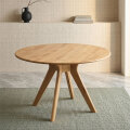 このダイニングテーブルは、アルダー無垢材を使用しており、自然の風合いを生かしたデザインです。丸型の天板は、どの席からも手が届きやすく、全員の距離を均等に保ちます。また、丸みを帯びたエッジが安全性を高め、家族での使用に最適です。脚の中央接合部が安定感を与え、しっかりとした構造を保っています。