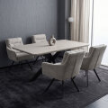 特徴 | 傷や水に強いメラミン素材の天板を使用した、お手入れ簡単なダイニングセットです。中心から8方向に広がるスチール脚がテーブル全体の重さを均等に分散させ、安定感のある構造となっています。チェアはたっぷりとした厚みのある座面クッションと、背中と腰をしっかり支える包み込む形状の背もたれで、長時間座っても疲れにくい設計です。座面には回転機構を内蔵しており、立ち座りや方向転換がスムーズに行えます。座面クッションは手洗い可能なカバーリング仕様で、清潔に保てます。 |