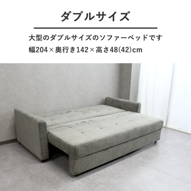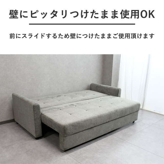 特徴 | ファブリック生地のソファーベッド。ゆったりした広さです。来客時などベッドとしてご使用いただけます。 |