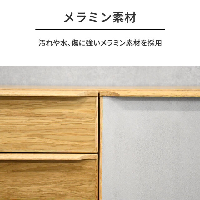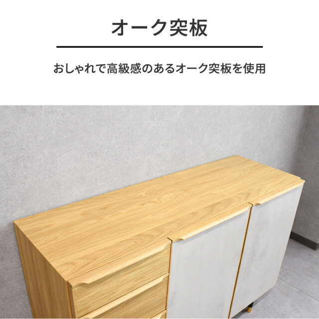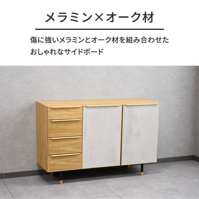 特徴 | 120cm幅のオーク材を使用したオシャレなリビングボードです。大半が完成されておりますので到着後すぐにご使用いただけます。 |