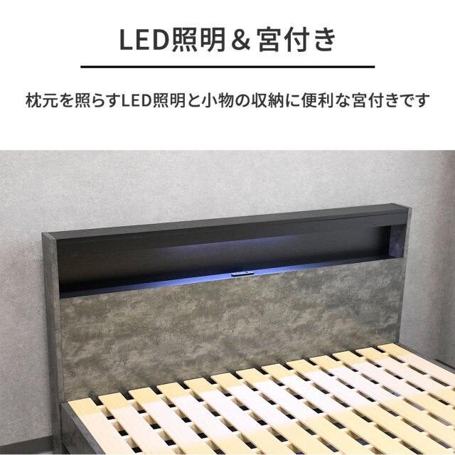 特徴 | 高級感のあるデザインの宮付きダブルベッド。収納・照明・コンセント付き。 |