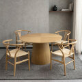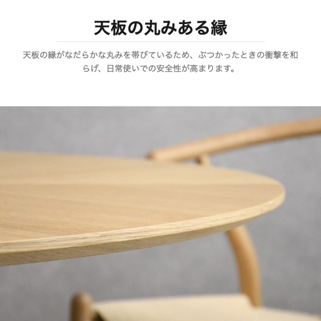 特徴 | 丸天板のダイニングテーブルセットは、角がなく安全性が高くなっています。台座は安定感があり、低重心でテーブル全体をしっかり支えます。チェアの座面は紙製コードで編み込まれており、体重を分散させ、弾力性を持たせています。背もたれは曲線構造で、長時間座っても体の負担を軽減します。 |