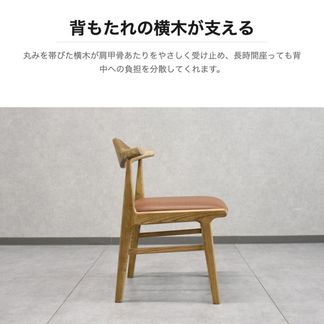 素材 | 特徴 | アッシュ無垢材を使用した高級感溢れるダイニングチェアです。背もたれは背中の形に沿ってゆるやかに湾曲したデザインで、座ったときに腰から背中をしっかり受け止めます。厚みのあるPUレザー座面が体重をしっかり受け止め、長時間座っても疲れにくい構造です。脚と脚をつなぐ横桟が四方に入っており、横からの力に対してもぐらつきを抑え、長く安心して使える強度を確保しています。ダイニングやカフェスペースにぴったりの北欧風デザインです。 |