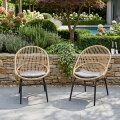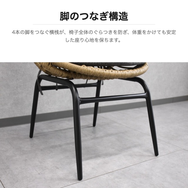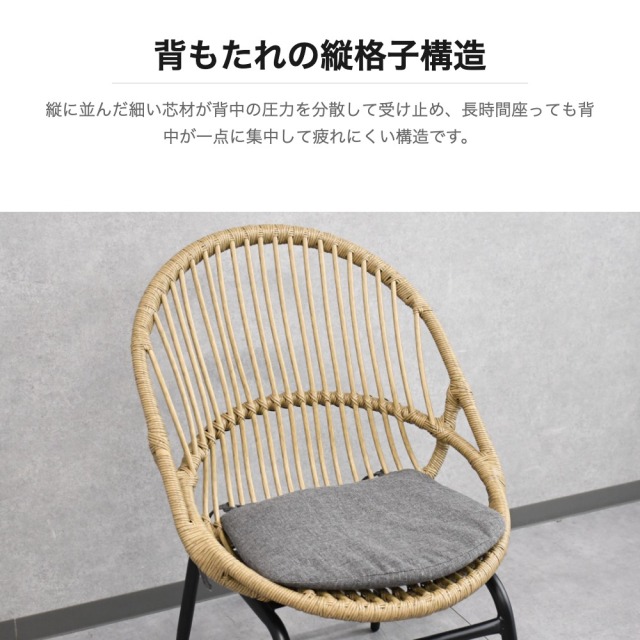 特徴 | ナチュラルなラタン調の編み込みデザインが美しいガーデンチェア2脚セットです。背もたれの縦格子構造が背中の圧力を分散し、長時間座っても疲れにくい設計になっています。座面は丸くカットされており、太ももへの圧迫を軽減します。取り外し可能なグレーのクッションが付属し、洗濯も可能で清潔に保てます。スチール製の脚は横桟でしっかり固定され、安定感があり、脚先には床を傷つけにくい丸みのあるキャップ付きです。 |
