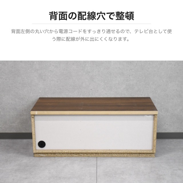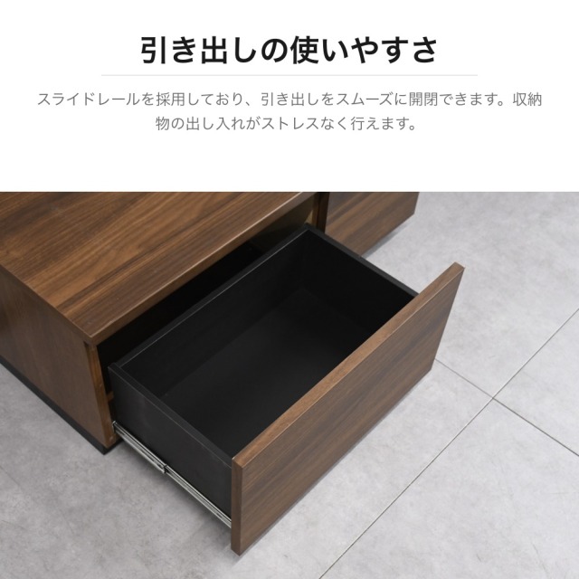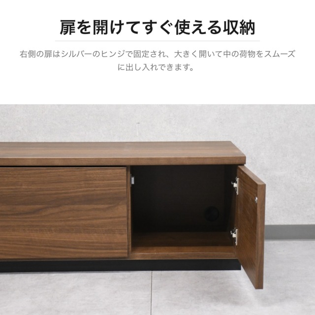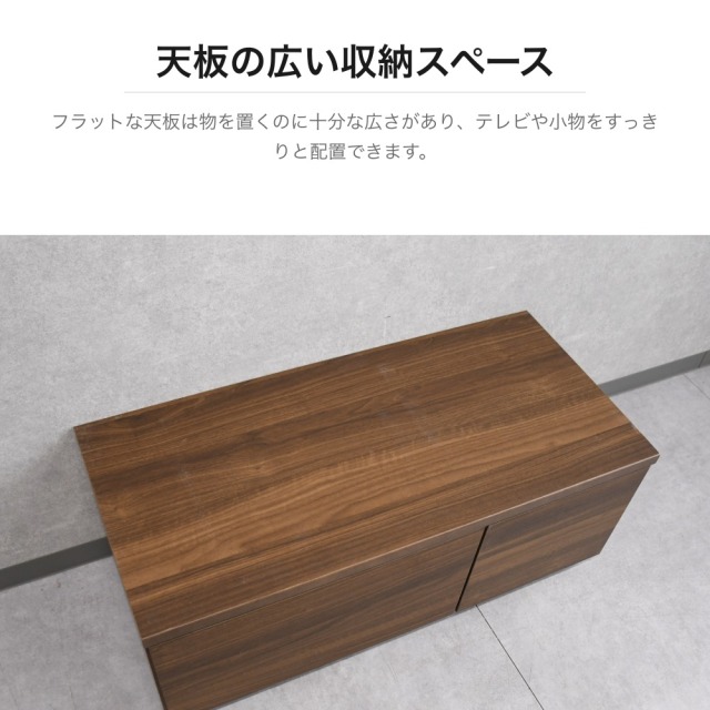 特徴 | ウォールナット調の美しい木目が特徴のコンパクトなテレビボードです。左側にはスライドレール付きの引き出し、右側には扉付き収納を備え、リモコンやDVDなどをすっきり収納できます。背面には配線穴があり、ケーブル類をきれいにまとめられます。幅90cmのコンパクトサイズで、一人暮らしや寝室用のテレビ台としても最適です。ブラックの台輪がモダンなアクセントを加えています。 |