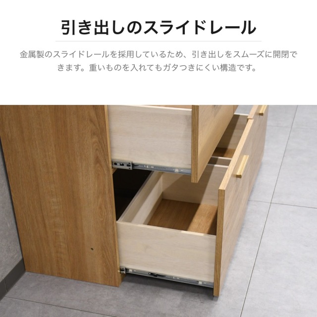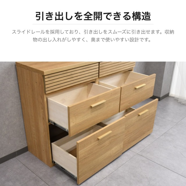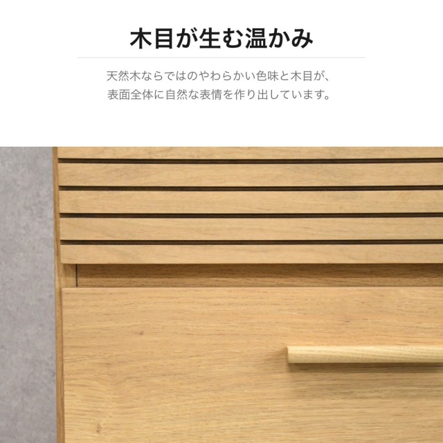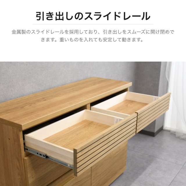 特徴 | 天然木オーク材を使用した温かみのあるサイドボードです。上段にはルーバーデザインの引き出し2杯、中下段には大容量の引き出し4杯を備えた収納力抜群の設計。金属製スライドレールを採用しており、引き出しをスムーズに全開でき、奥まで使いやすい構造です。天板は広く平らに仕上げられており、ディスプレイスペースとしても活用できます。リビングやダイニングの収納家具として幅広くお使いいただけます。 |